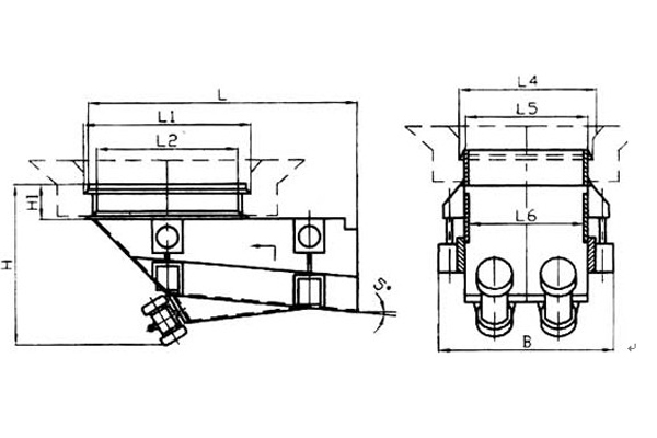 慣性振動(dòng)給煤機(jī)由機(jī)架、底板(給煤槽)、傳動(dòng)平臺(tái)、漏斗、閘門、托輥等組成。當(dāng)電機(jī)開動(dòng)后經(jīng)彈性聯(lián)軸器、減速機(jī)、曲柄連桿機(jī)構(gòu)拖動(dòng)傾料5°的底板在輥上作直線往復(fù)運(yùn)動(dòng),煤均勻地卸到其他設(shè)備上。